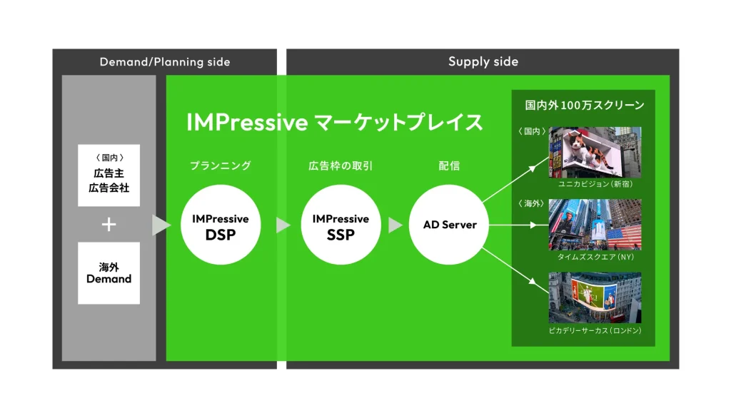 IMPressive マーケットプレイスでの取り扱い面は現在、日本国内・海外合計で120万を超えており、日本国内においてはクロス新宿ビジョン・ユニカビジョンをはじめとする国内各主要媒体を皮切りに、IMPressiveマーケットプレイスへの接続を拡大。グローバルマーケットにおいてもニューヨーク・タイムズスクエアのスクリーンや、ロンドン・ピカデリーサーカス、タイ・Plan・B社などのスクリーンメディアを直接バイイングすることが可能となります。